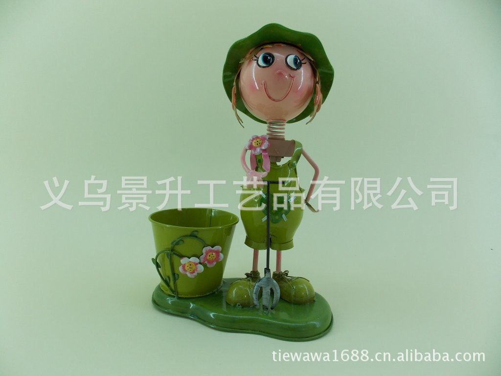 义乌景升工艺品有限公司铁娃娃从大号的人物铁娃娃垃圾桶、铁娃娃插花桶,铁娃娃种花桶,铁娃娃花盆,渐渐的发展到情侣娃娃笔筒,相框,时钟等生活礼品。铁娃娃凭借长时间不易褪色,环保和独特的造型,新颖美观的设计,高标准的质量,很快得到了各大商场、超市和消费者的好评和认可。