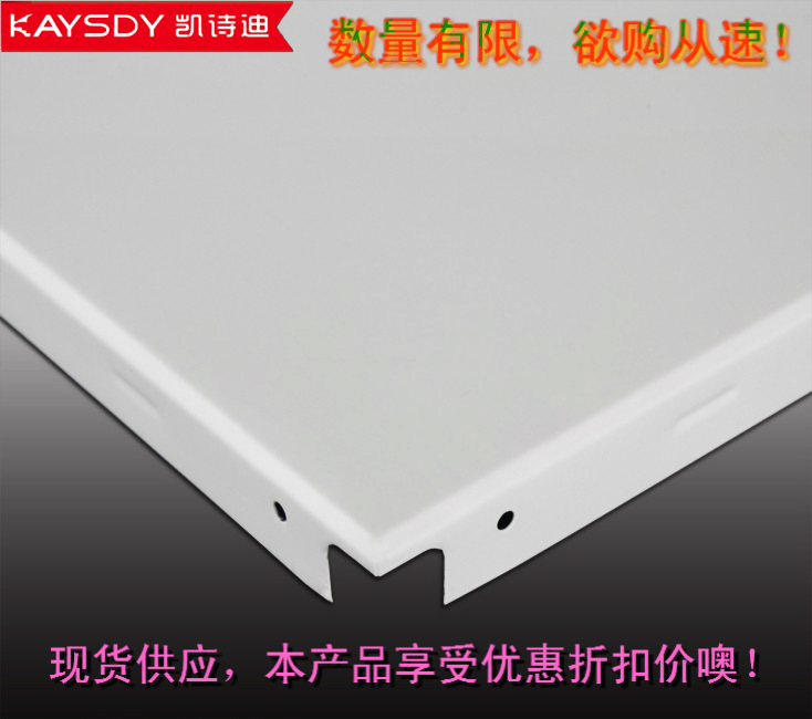 凯诗迪暗骨方型扣板厚度分为0.5 mm、0.6 mm、0.7 mm、0.8 mm、0.9 mm、1.0 mm、1.2 mm。扣板表面涂层一般选择粉末静电喷涂或聚脂漆喷涂、辊涂,也可选用拉丝和阳极氧化表面处理。常用规格有300x300mm、300x600mm、400x400mm、500x500mm、600x600mm、600x1200mm、300x1200mm、600x900mm、600x1800mm。