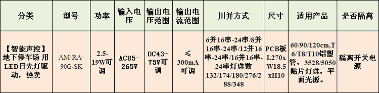 AM-RA-90G-SK 声控感应LED日光灯电源是专为地下停车场、楼梯过道等长时间照明场所设。计的智能型声控感应控制单路输出的经典隔离恒流开关电源。