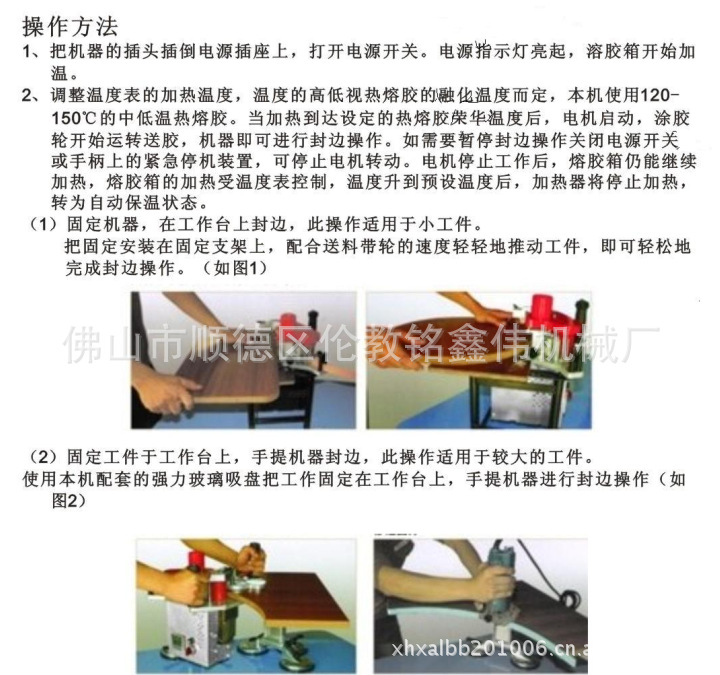 下图为操作示意图:本店销售的是右款带调速功能,性价比高,可批发,销售热线:0757-23624568。整机保修一年。左款暂不生产!!有关参数:弧边最小直径:40MM进给速度:0.5-3.5M/MIN 封边机厚度:0.3-3MM 封边宽度:10-45MM 工作温度:150-200度 电机功率:15W 总功率:765W 电源: 220V/50HZ胶罐体积:270ML纸箱包装尺寸: 465X430X515MM 总重:15KG 操作注意事项如下:调速/调温/轻便型/配送支架,发热管,试用胶,调试工具,说明书常见问题:问:为什么前面一有胶,后面就没胶了呢?答:用螺丝刀搅下胶锅底,直到上胶口和下胶口型成对流胶。上下胶口通透就行了。问;为什么电机不转?答:因为在胶没有完全溶解之前是开不起电机的。所以电机按扭先不要起动。