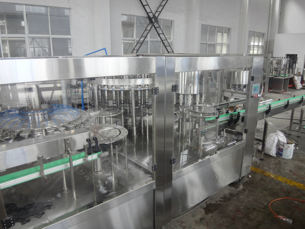 RXG系列热灌装机标准机型为“三合一”,针对特殊生产条件,可增加一道消毒液冲瓶,即“四合一”。系统充分考虑饮料产品的特性(如茶饮料和混合果汁饮料易起泡)及热灌装的主要技术要求。