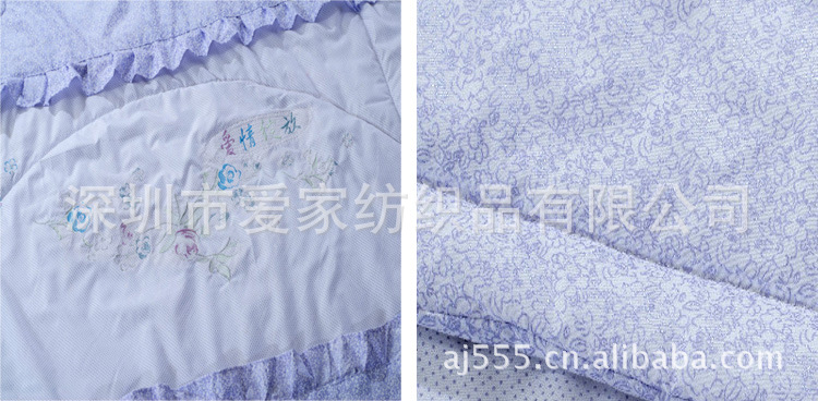 产品说明 | 小碎印花与爱情绽放的精致刺绣工艺完美结合,给你带来无限浪漫的爱情夏日。 我们选用的是高织高密磨绒面料。采用环保印染,色泽鲜亮,层次丰富触手柔软,贴身舒适。填充物采取高科技中空透气羽丝绒。该羽丝绒有良好的透气性,回弹性良好,易机洗,盖在身上更加轻薄透气,最适合贴身使用,厚薄适宜,开着空调入睡,不冷也不热。正品保证!市场同等质量产品价格最低,让你百分百放心。 |