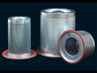 油气分离元件是决定空压机压缩空气品质的关键部件,高质量的油气分离元件不仅可保证压缩机的高效率工作,且滤芯寿命可达数千小时。从压缩机头出来的压缩空气夹带大大小小的油滴。大油滴通过油气分离罐时易分离,而小油滴(直径1um以下悬浮油微粒)则必须通过油气分离滤芯的微米及玻纤滤料层过滤。油微粒经过滤材的扩散作用,直接被滤材拦截以及惯性碰撞凝聚等机理,使压缩空气中的悬浮油微粒很快凝聚成大油滴,在重力作用下油集聚在油分芯底部,通过底部凹处回油管进口返回机头润滑油系统,从而使压缩机排出更加纯净无油的压缩空气。压缩空气中的固体粒子经过油分芯时滞留在过滤层中,这就导致了油分芯压差(阻力)不断增加。随着油分芯使用时间增长,当油分芯压差达到0.08到0.1Mpa时,滤芯必须更换,否则增加压缩机运行成本(耗电)。