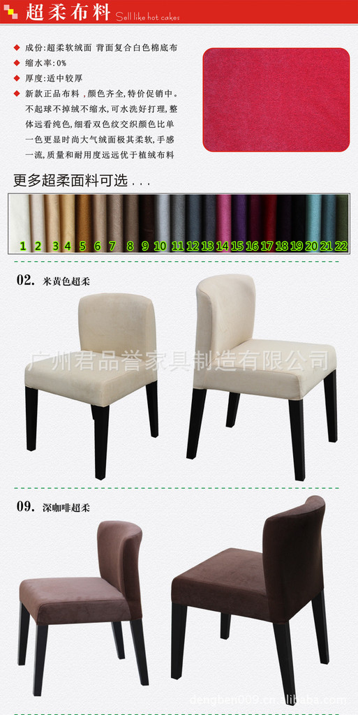 广州君品誉家具制造有限公司主营酒店宴会系列、酒店客房家具、工程家具、沙发等产品专业生产加工的私营独资企业。我厂自二零零二年建厂以来,以可信耐的产品质量,优质的售前售后服务赢得了广大客户的青睐及业界的认可。 此款餐椅餐用优质铁管,经酸洗磷化,表面贴木纹纸处理,外观美观大方。赶紧订购吧?0757-28788548;0757-28863536 |