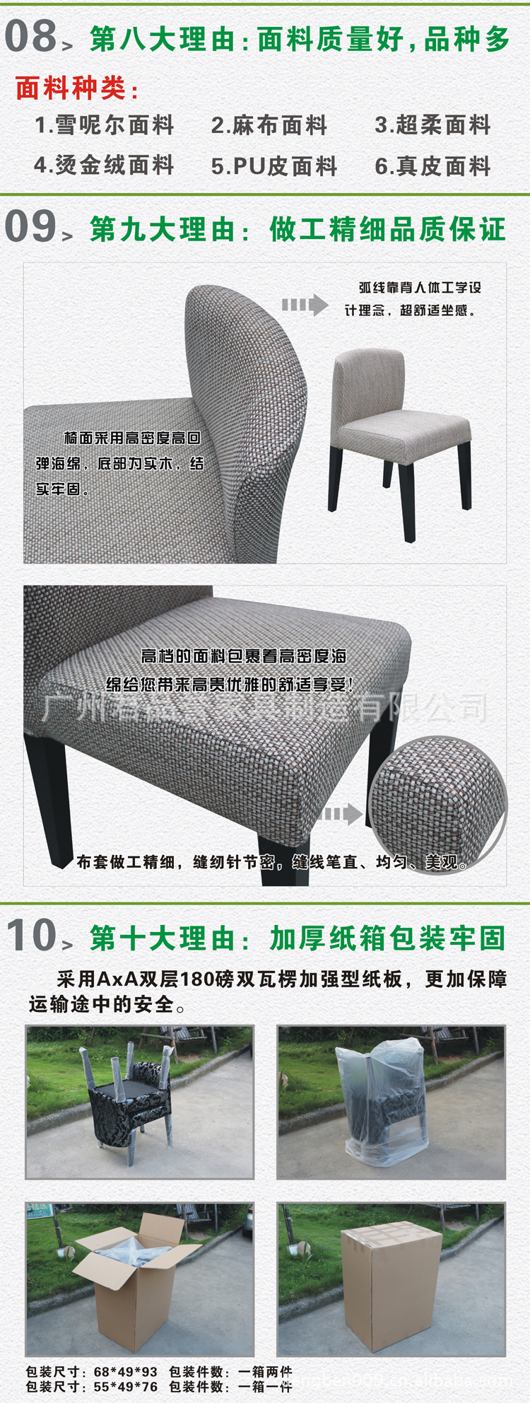 本公司长期专业生产供应各种规格款式的酒店椅,餐饮用椅,铝合金椅子,铁椅,酒店椅套、桌布等系列产品,款式多样,款色齐全,亦可根据客户的需求定做,产品选材用料严格,生产工艺成熟,不仅质量可靠,且美观耐用。椅子可根据特定的场合和需求更换不同风格的椅套,广泛适用于各酒店,餐厅,酒楼婚庆宴会等场所。欢迎广大新老客户来电咨询订购!订购电话:18819292995. |