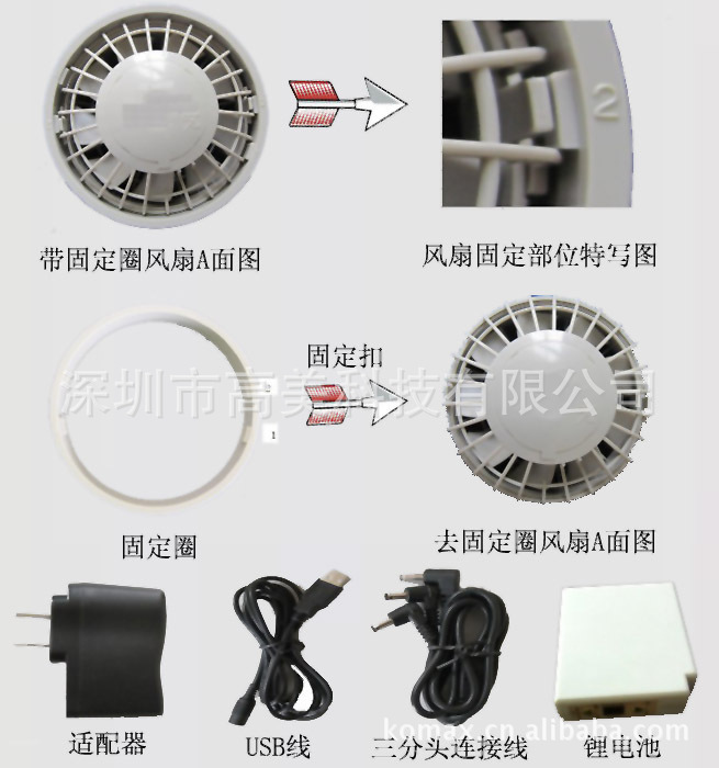 分图片:二、安装步骤: 1.风扇A面朝上,往风扇内侧按住两个固定扣,取出固定圈。 2.取出后,把风扇A面朝衣服内侧装入衣服上的预留孔内,扣上固定圈。 注意:务必使固定圈上的1处或者2处对准固定扣。衣服较薄时选1对准,较厚时选2对准。 3.同样方法装好另一风扇后,用三分头连接线中的两个分线头分别对应插入风扇上的插孔, 另一头与锂电池对接,调整好距离,主线头连接电池或者带适配器USB线4.由于固定扣受力面积小,取固定圈时,只需轻轻将固定扣往里按压,不需要用太大力,否则容易折断。三:注意事项:1.锂电池使用温度应保持在-20~50℃之间;避免将电池投入火中;避免将电池投入水中;导致电池损坏。 长期不用的锂电池,应该存放在阴凉偏干燥的地方,以半电状态(满电电量的70--80%)最好。 2.衣服需要清洗时,所有风扇部件需要全部卸下,以免损坏。 3.所有配件不防火、不防水;请使用原装配件,以免损坏相关部件!