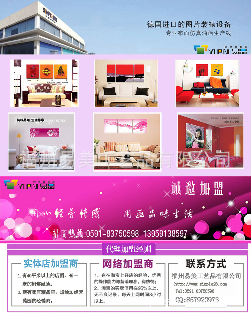 易品,品牌为福州易美工艺品有限公司所有.公司主要从事装饰画及钟表设计,开发,生产与销售.