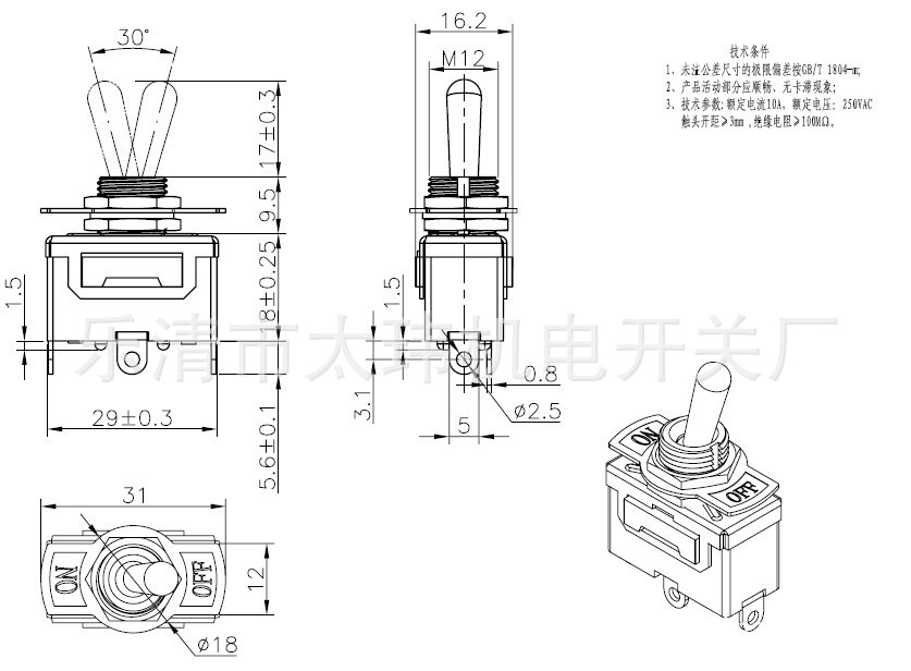 极数 | 1 极SPDT | 安装孔尺寸 | 直径:12.5mm |