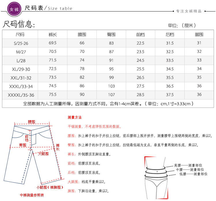 本公司有16年的专业设计、生产、销售女裤经验,只做中高档裤子,性价比高,更注重的是产品质量,商客请不要拿地摊货跟我们做比较,本司绝不做地摊货,客人想要的是好的KK、值得信赖的KK;本季度新款推出,款式时尚、面料舒适、淑女百搭,让您成为当季潮浪尖领潮儿!