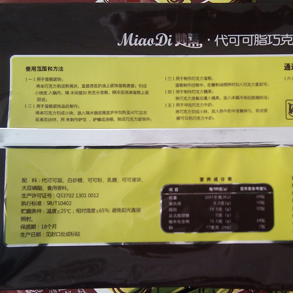 主要原料:代可可脂、白砂糖、奶粉、大豆磷脂、食用香料等。