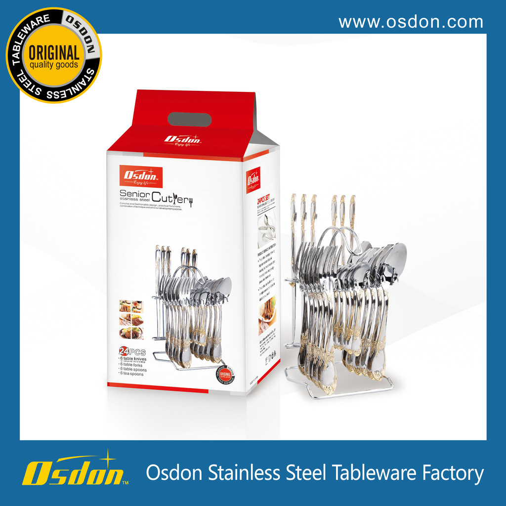 产品包装:1. 礼盒包装 规格:34.5cm*26cm*4cm 外箱尺寸:54cm*36cm*77cm装箱规格:24支(各6支)*12盒 需另礼盒费2.普通包装 ①单支产品入一个透明塑料胶袋,②每12支/24支产品装一个白色内盒③6pcs一卡袋(OPP袋包装、卡头多种选择,袋费用需另计)④装箱尺寸:根据产品内包装类型而定关于我们 揭阳市奥斯顿五金实业有限公司是一家集研发、制造、销售和品牌营运为一体的现代化综合企业,企业规模宏大技术力量雄厚,拥有先进的生产设备和敢于创新的研发团队,主要生产不锈钢西餐刀叉。座落于素有“不锈钢制品之都”的粤东地区-揭阳市。奥斯顿五金实业有限公司长期与国内外各大超市和贸易公司合作,积累了丰富的合作经验和具备强大的产品创新能力。拥有花园式生产基地,占地10000平方米,现有员工300余人,热忱各界朋友来我司参观指导。 尊敬的新老客户,本厂专业生产:不锈钢餐具、西餐刀叉勺、西餐刀叉套装/优质的质量和最好的服务来回报所有的客户!谢谢!产品可加工定制新款式及形象LOGO。如有需要的客商请与本厂联系,本厂会以最低的价格!