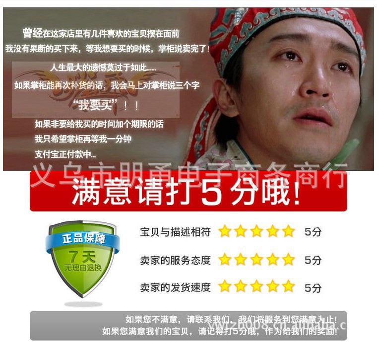 6作为卖家,我们会用心地对待我们的每一笔交易,尽量让每一个买家都感到满意。网络交易,诚信为王。我们对产品的要求和把控极其严格,所有的产品在出货前均会经过采购、QC、仓管相关人员的三次质检,确保发货到您手里的产品是合格产品,请您在收到产品后尽快确认。