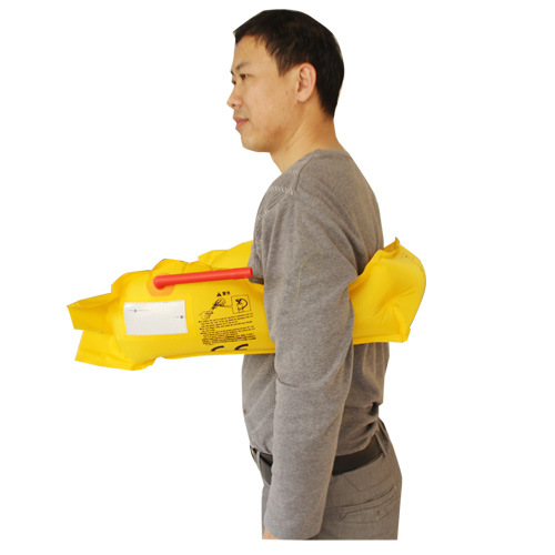 充气式救生衣主要由密封充气式背心气囊、微型高压气瓶和快速充气阀等组成,在有掉入水中可能性的工作中经常使用。,正常情况下(未充气),整个充气式救生衣如同带状穿戴披挂在人的肩背上,由于体积小巧,并不妨碍人们的作业自由;一旦落入水中,在水中遇到危险需要浮力的紧急时刻,或根据水的作用自动膨胀充气(全自动充气救生衣),或由人拉充气阀上的拉索(手动充气救生衣),便可在5秒钟时间内充气变成具有8~15公斤浮力的救生衣;救生衣向上托起人体,使头、肩部露出水面,从而能够及时获得安全保