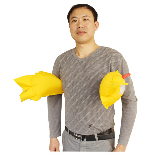 功能原理:在入水前或者入水后,手拉绳子使得膨胀装置打开;当刺针刺穿高压CO2气罐密封口时,高压的CO2会在5秒钟内充满整个气囊,然后就会产生110N的浮力。使用完之后,利用排气阀把气体放完,以免下次使用的时候充爆。