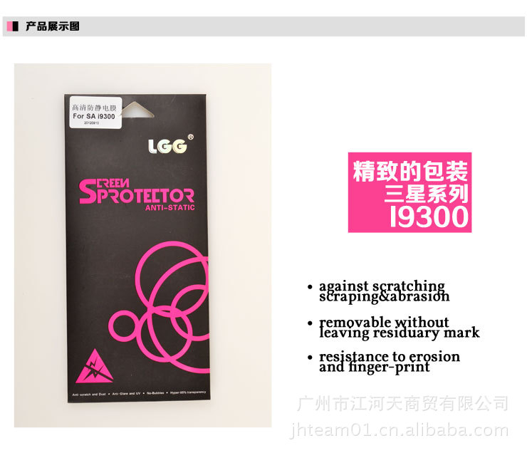 商品描述:◆ 高透贴膜--特点:1、顶级亚光高清材质贴膜。2、高强度Pet,防尘,防磨,防刮花,防眩光。3、高达4H硬化处理,有效防止屏幕刮伤。4、静电吸附,无残留胶质,可重复粘合使用。5、LCD贴心保护,优质画面表现。 使用方法:1.先把保护膜放在液晶屏上面,确定张贴方向。 2.用纤维布把液晶屏上的指纹,尘埃,油渍及污垢试去。 3.利用贴在保护膜上的可移贴纸,把 底纸撕去。 4.将保护膜轻轻的贴在屏幕上,用平整的刮片将气泡去除。