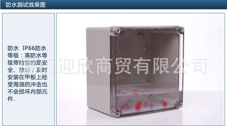 二, 产品性能与同类产品对比:(优点) 1. 丰富的规格型号可选择 产品规格型号齐全,防水盒的产品规格一千多种,为国内同行之最 我们知道您的需求是全方位的,正在为了满足不同项目的需要,寻找最适合的产品。因此我们开发了各种规格的防水盒模具。(分:高,中,低,三种档次可选)总有一款适合你的。 2.质量可靠: 中,高档产品材料使用全新料注塑而成,.壁厚比常规的厚一毫米左右,上盖与下底的对缝处,采用的特殊的加强筋,使防水盒强度增大不会变形,从而提高了防水的性能 四角螺丝在盖子上面不会脱落,安全性高。盒子内部常规的M4铜螺母。更方便客户固定产品。 3.极速响应 最快速最有效的反应,即时答复,您用电话,MSN,QQ,在线客服和我们联络,均在可在5分钟内得到有效响应。您用传真,电子邮件和我们联络,均可在30分钟内得到有效响应。 常规产品我们随时保持库存,可以快递为你提供。最快供应周期为工作日时的1小时内, 跟据客户的方便可以先择不同的运输方式。(快递运输,江 浙 沪三省第二天可到达其它地区需要隔日到。偏远山区可通过EMS邮寄。) (物流运输,江 浙 沪三省第二天正常也均可到达,其它地区要隔日到,如果中途需要中转的,就需要四到五天的时间到。) 4 灵活方便的交易方式 您可以通过电话或网络获得报价,并随时下订单。有公司账户及个人账户。满足不同客户的操作方便。 5无最小订购额限制。 三,客户订货需知: 1. 订货前确认好防水盒的材质(ABS,PC,透明或不透明)是否阻燃,或有什么特殊要求。如果需要改变防水盒的颜色,可以提前预定。 2. 如果需要开孔进出线的,请提供开孔图纸。如果需要配防水接头,或者接线端子等其他配件的请跟业务员确认好。 3. 客户在批量订货的时候(500只起)可做贴牌,如果有客户需要订做自已的商标或其它要求的可以提前通知。, 4. 因为有客户在使用防水盒的时候螺丝拧的太紧或用电钻拧力过大导致螺丝受损或断裂。(提醒:在拧螺丝的时候要用力适当,只要上下盖对紧了就可以了,因为中间有密封条,不要拧的太紧。)假如有上述螺母受损的情况,也没关系,请尽快联系我们,我们会在最快的时间给你配套快递过去。当然一般是不会出现这样情况的。 |