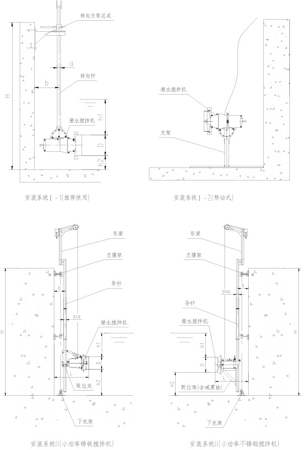 潜水搅拌机必需完全潜入水中工作;不能在易燃易爆或有强腐蚀性液体的环境中工作;钢膨胀螺栓须按要求固定,安装完毕后,必须将电缆拉紧固定好.