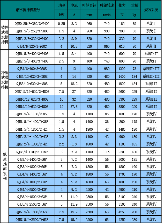 gulan潜水搅拌机是引进德国潜水电机密封技术研制成功的。经过多年的实践摸索,因其在形式、结构和试验方法上的创新,使得gulan 潜水搅拌机总体性能达到了国外同类产品的水平。QJB 型潜水搅拌机可分为混合搅拌和低速推流两大系列。混合系列搅拌机适用于污水处理厂和工业流程中搅拌含有悬浮物的液体;低速推流系列搅拌机适用于工业和城市污水处理厂曝气池,其产生低切向流的强力水流,可用于循环及硝化、脱氮和除磷阶段创建水流等。