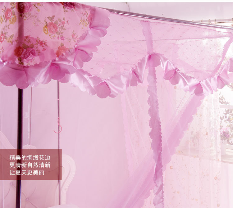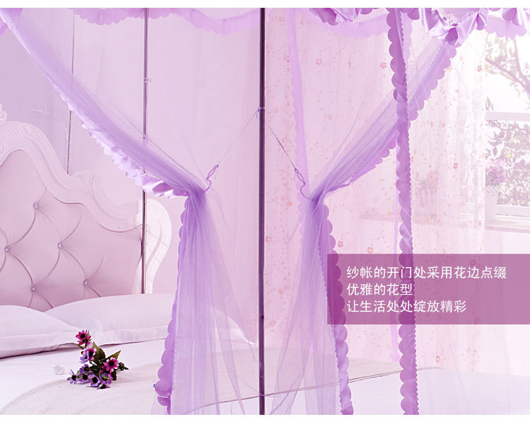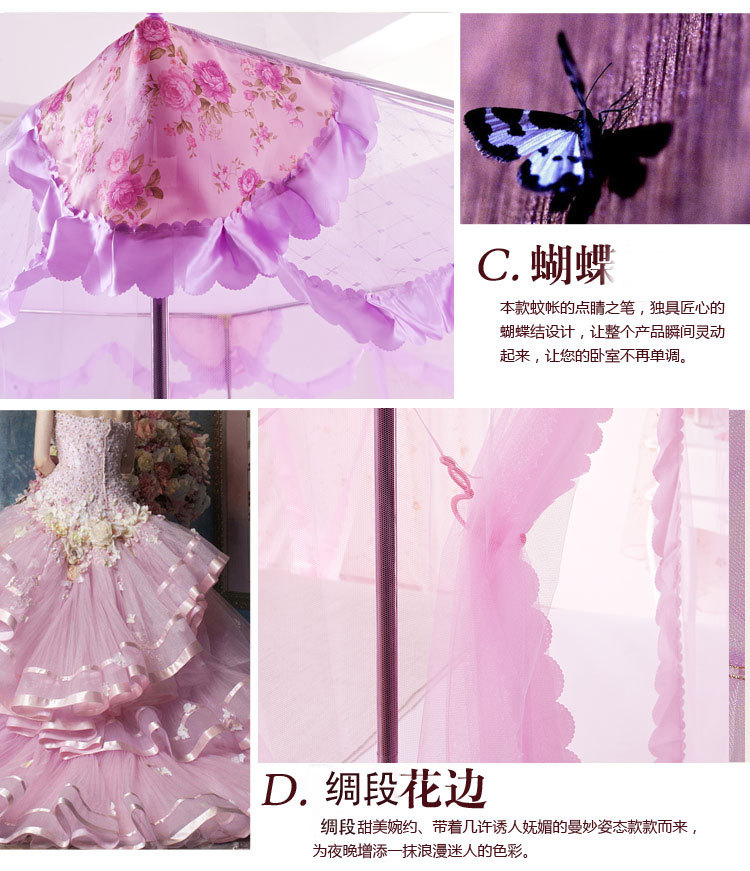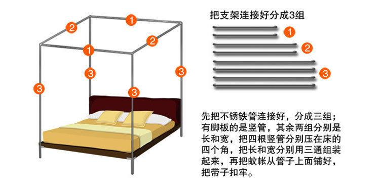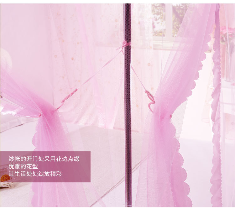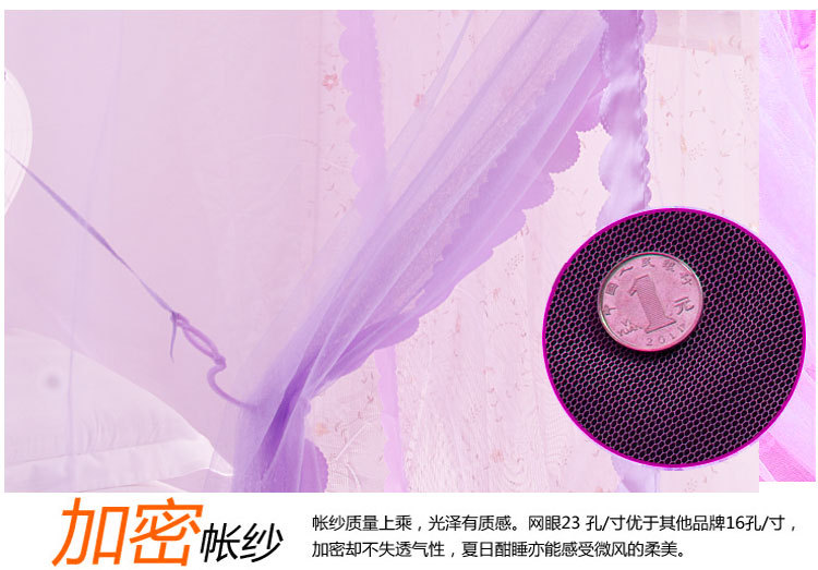 蚊帐按照目前市面上常见的材质可将蚊帐简单分为三种:蒙古包式蚊帐1、棉纱帐。优点:透气性好,耐用,价格便宜;缺点:清洗不方便,吸水太多,容易乱丝。 2、真丝帐。优点:柔软,体积小,质地轻,携带方便;缺点:容易褶皱,透气性一般,价格偏高。 3、化纤帐。优点:有立体感,质地柔软,透气性好,轻巧耐用,方便洗涤;缺点:暂无。 按照外型来分,可分为三种: 1、圆顶,又称“蒙古包”。蒙古包一般是两开门,优点是:安装方便,架子稳固,价格便宜。缺点是:空间小,阻挡视线,看电视不方便。 2、方顶四方三开门。宫廷式蚊帐,方顶四方三开门蚊帐相对来蒙古包来说,在样子上看上去更漂亮一些。优点:样式漂亮。缺点:不太稳定,价格偏高。 3、四边弧形。一般吊在天花板上。优点:外型华丽高贵,美观大方。缺点:价格偏高。总和说来一般空间比较开阔的使用四边弧形和方顶四方三开门的蚊帐。蚊帐特点: 蚊帐布料:采用进口涤纶纱,小梅花,网眼密度:26洞/平方厘米、21洞/平方厘米,纤维细度:50D,帐布结实、光洁、密集,透气性蚊帐轻盈透气,易洗易干,不易抽纱,耐洗耐用。1) 简易型蚊帐:两边缝有布洞,可把竹杆穿过布洞支承蚊帐, 帐顶四角有绑绳,可固定,方便使用。2) 带支架蚊帐:A. 不绣钢支架:驳口牢固,硬度大,光泽亮,不弯曲,不会变形,平衡性好,可伸,中间可以悬挂风扇,不生锈,安装方便,较耐用。B. 轻质碳纤维支架:牢固坚韧,可折叠, 折叠处接口圈表面为镀铬处理,永不生锈,携带与收藏都很方便。3) 蚊帐设计,单门与开双门,床侧、床尾开门,帐门有双层花边装饰。4) 安装灵活方便,可根据床的摆放位置确定安装方式(即蚊帐支架安装床侧或床头,也可安装在床侧床头位的墙上)。