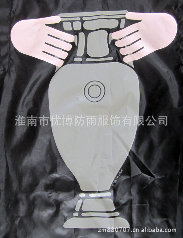 该款式为2012年欧洲足球赛专用雨衣,使用高档防雨面料,内层为AC胶涂层,前片带口袋,前后印制欧洲杯LOGO标志,不变形不褪色,是理想的户外休闲雨衣。