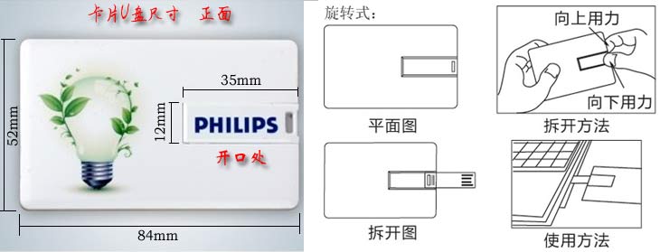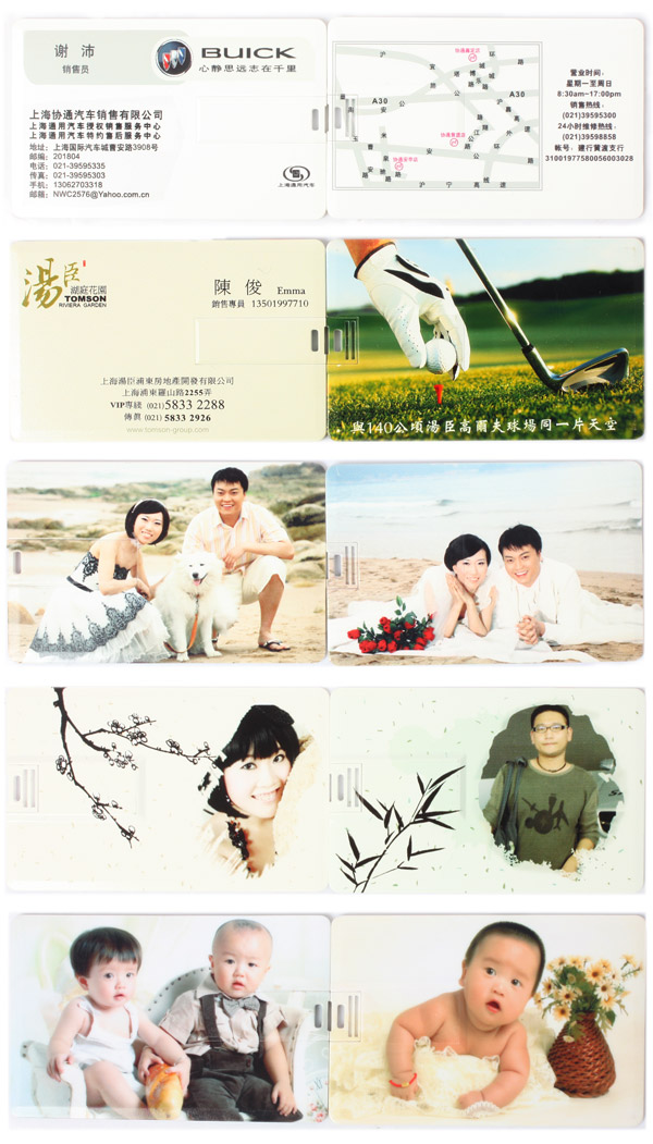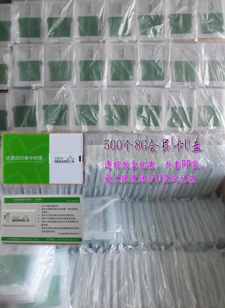 名片式U盘旋转款使用方法如下: 卡片U盘又称名片U盘,由ABS材料制成,外观和标准银行卡一样,长宽为84*52mm,厚度为1.2-2mm。卡片U盘因为可以印刷各种精美彩色图案而成为优秀的广告载体,成为电子礼品业的首选。普通U盘进行宣传,只能在外观上做公司的LOGO,当时或一时起作用,过后就失去了宣传效果。卡片U盘,除可在外观上做公司的LOGO外,还可在U盘芯片里做企业的广告宣传片及产品介绍等。卡片U盘一般使用寿命是5-6年(好的8-10年没问题),等于企业花了一次钱,做了几年的广告,这样,通过客户之间口啤的宣传,更有信誉和真实性,有助于客户量的增加。可谓一次购买,终身服务。 以下为部分客户订制的实例参考图案: 代工网易花样卡片U盘,顺利交货。以下为图片欣赏和网易活动链接: