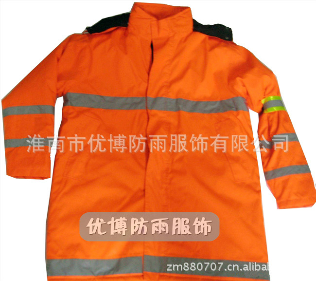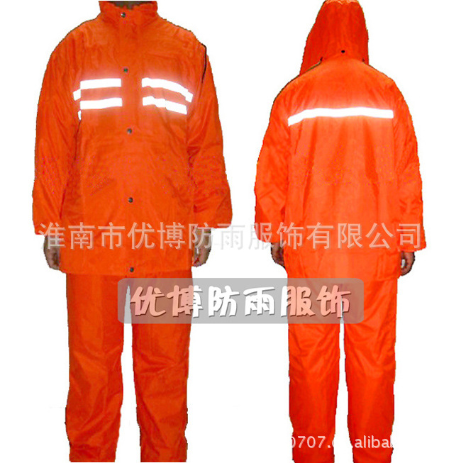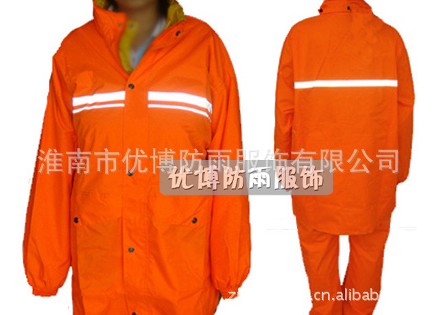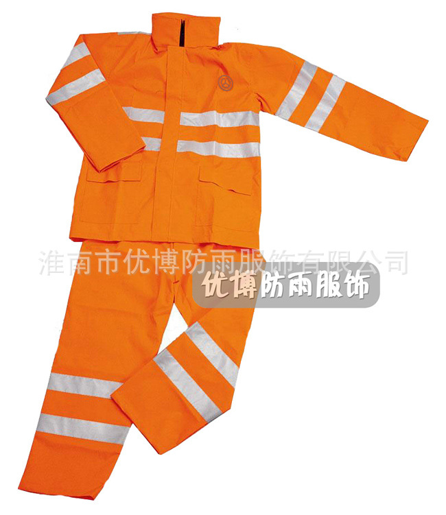 本品为涤丝纺防雨面料,加100%PVC防水涂层,高强度反光条,双层防沾身透气网格设计,暗藏式帽子,上下分体套装,防盗防水口袋,休闲款式,适合环卫市政人员穿着!