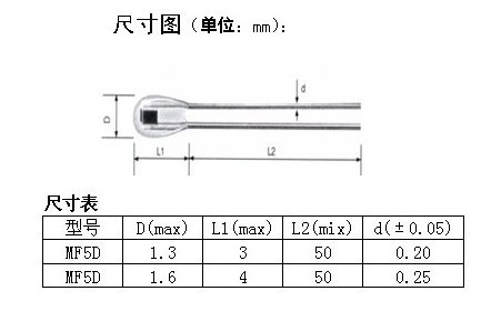 注:头部尺寸: 1.0MM~2.0MM(可以根据客户要求订做) 线 长: 20MM~150MM(可以根据客户要求订做) 二:产品特点: 1:MF5D系列产品为径向引线单端玻璃封装型 2:稳定性好,可靠性高 3:阻值范围宽:1KΩ~200KΩ 4阻值和B值精度高 5:玻璃封装,可在高温和高湿等恶劣环境下使用 6:体积小,结构坚固,便于自动化安装 7:使用温度范围-40℃~+300℃ 8:额定功率:≤25mW 9:热感应快,灵敏度高等 三:产品应用范围: 1:电磁炉,电压力锅,电饭煲,电烤箱,消毒柜,微波炉,电取暖炉等家用电器的温度控制及温度检测 2:电子体温计 3:工业,医疗,环保,气象,食品加工设备的温度控制与检测 4:温湿度计的温度控制与检测 四:MF5D系列型号规格 型号 | 额定电阻值(R25) | B值 | 工作 温度 | 耗散系数(mW/℃) | 热时间常数(S) | 电阻值 (KΩ) | 允许偏差 (± %) | 标称值 (K) | MF5D-2.3K-3950 | 2.3 | ±1% ±2% ±3% ±5% | 3950 | -40℃ ~ +125℃ | ≥0.7 静止空气中 | ≤5 静止空气中 | MF5D-502-3470 | 5 | 3470 | MF5D-103-3435 | 10 | 3435 | MF5D-103-3950 | 10 | 3950 | MF5D-503-3950 | 50 | 3950 | MF5D-104-3950 | 100 | 3950 | MF5D-204-3950 | 200 | 3950 |