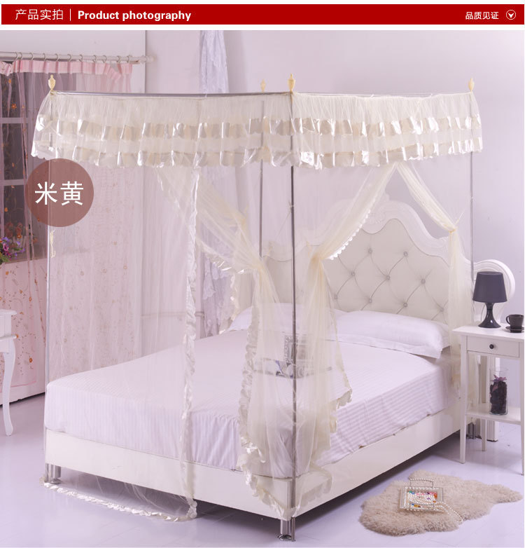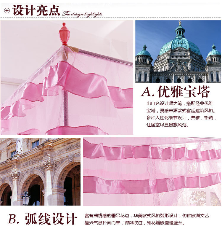 蚊帐按照目前市面上常见的材质可将蚊帐简单分为三种:蒙古包式蚊帐1、棉纱帐。优点:透气性好,耐用,价格便宜;缺点:清洗不方便,吸水太多,容易乱丝。 2、真丝帐。优点:柔软,体积小,质地轻,携带方便;缺点:容易褶皱,透气性一般,价格偏高。 3、化纤帐。优点:有立体感,质地柔软,透气性好,轻巧耐用,方便洗涤;缺点:暂无。 按照外型来分,可分为三种: 1、圆顶,又称“蒙古包”。蒙古包一般是两开门,优点是:安装方便,架子稳固,价格便宜。缺点是:空间小,阻挡视线,看电视不方便。 2、方顶四方三开门。宫廷式蚊帐,方顶四方三开门蚊帐相对来蒙古包来说,在样子上看上去更漂亮一些。优点:样式漂亮。缺点:不太稳定,价格偏高。 3、四边弧形。一般吊在天花板上。优点:外型华丽高贵,美观大方。缺点:价格偏高。总和说来一般空间比较开阔的使用四边弧形和方顶四方三开门的蚊帐。蚊帐特点: 蚊帐布料:采用进口涤纶纱,小梅花,网眼密度:26洞/平方厘米、21洞/平方厘米,纤维细度:50D,帐布结实、光洁、密集,透气性蚊帐轻盈透气,易洗易干,不易抽纱,耐洗耐用。1) 简易型蚊帐:两边缝有布洞,可把竹杆穿过布洞支承蚊帐, 帐顶四角有绑绳,可固定,方便使用。2) 带支架蚊帐:A. 不绣钢支架:驳口牢固,硬度大,光泽亮,不弯曲,不会变形,平衡性好,可伸,中间可以悬挂风扇,不生锈,安装方便,较耐用。B. 轻质碳纤维支架:牢固坚韧,可折叠, 折叠处接口圈表面为镀铬处理,永不生锈,携带与收藏都很方便。3) 蚊帐设计,单门与开双门,床侧、床尾开门,帐门有双层花边装饰。4) 安装灵活方便,可根据床的摆放位置确定安装方式(即蚊帐支架安装床侧或床头,也可安装在床侧床头位的墙上)。