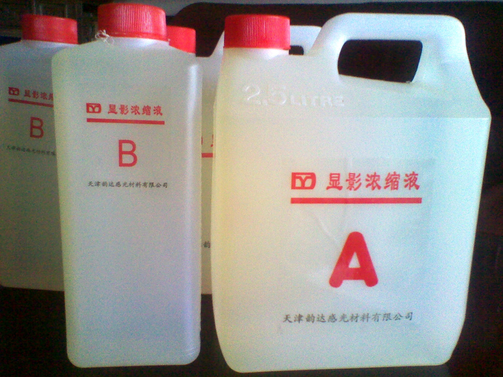 将显影槽和定影槽分别注入30立升优质水,搅拌下分别将显影浓缩液A和B、定影浓缩液A和B倒入各自加工槽内,搅拌均匀即可使用。