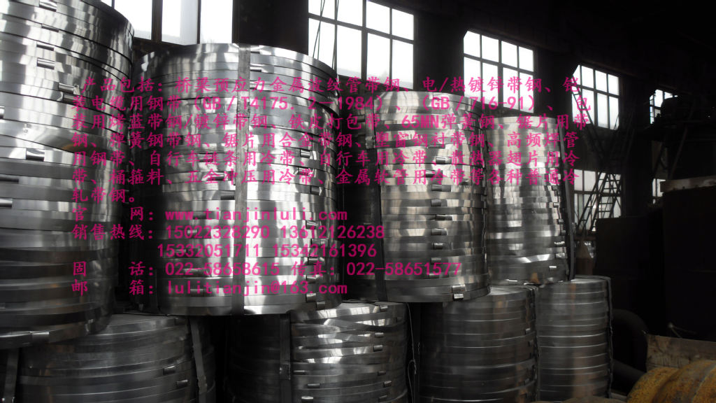 主要产品:烤兰打包带、冷轧带钢、家具合页、打包扣、打包角、电缆皮、带钢、喉箍料等系列产品。烤兰打包带为我公司的拳头产品,多年来受到广大客户的好评,产品销往全国各地。 选用优质碳素结构钢经轧制烤兰而成,产品经文安质量监督局检测符合国标GB4173-84,公司现有烤兰生产线两条,年生产能力6000吨,规格(0.3-1.0)×(12-32)mm,每盘50kg,由两小盘组成,每小盘为一个头,因此又叫无接头打包带。