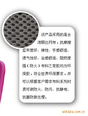 网布:我们公司采用的是台湾颐达网布,抗磨擦坚牢底度高、弹性好、手感舒适、透气性好、坐感舒适、阻燃度强(防火)布料之背胶均为环保胶,符合世界环保要求,并可以根据客户需求布料系列材质可做防火、防污、抗静电、抗菌防微处理。