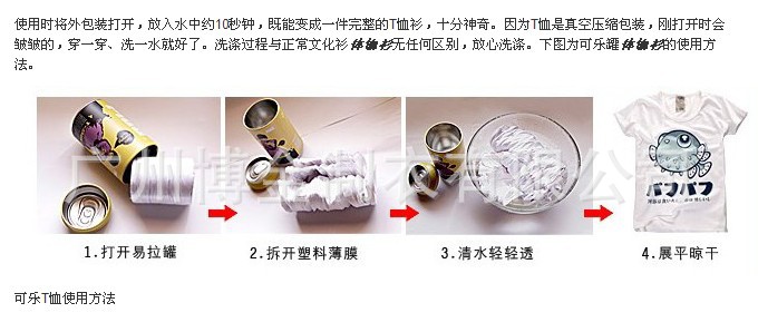 使用时将外包装打开,放入水中约10秒钟,既能变成一件完整的T恤衫,十分神奇。因为T恤是真空压缩包装,刚打开时会皱皱的,穿一穿、洗一水就好了。洗涤过程与正常文化衫体恤衫无任何区别,放心洗涤。下图为可乐罐体恤衫的使用方法。