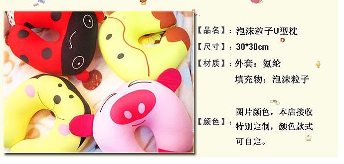 | 产品特点及用途 | 【U形按摩枕头】: U形PP棉枕头,内置按摩器,具有保健按摩功效,疲劳时把它放在颈部按摩,促进血液循环,抗疲劳,现已成为白领人士的必备午睡颈枕, 超柔面料柔软舒适,填充中空环纤维棉,可以很好的贴切身体,缓解疲劳。 作为玩具,汽车用品,可枕可靠非常的舒适时尚喔,同时具有保健的功能,带一个回家吧。 可爱卡通,让你一天都有好心情,亿美辰家居,一直专注于布艺产品的设计和生产,并致力于通过一流的品质和服务,成为群众心中的品牌,为企解决问题 广大商家们,你还在等什么,错过亿美辰礼品,你将错过一次商机 |