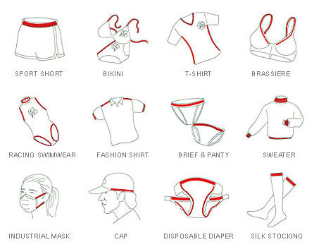 T恤、毛衫、内衣裤、运动服装、瑜伽服,婴儿服装、泳装、裕袍等针织服装;口罩、袜子、桌椅套、帐蓬等需要有弹力的地方;