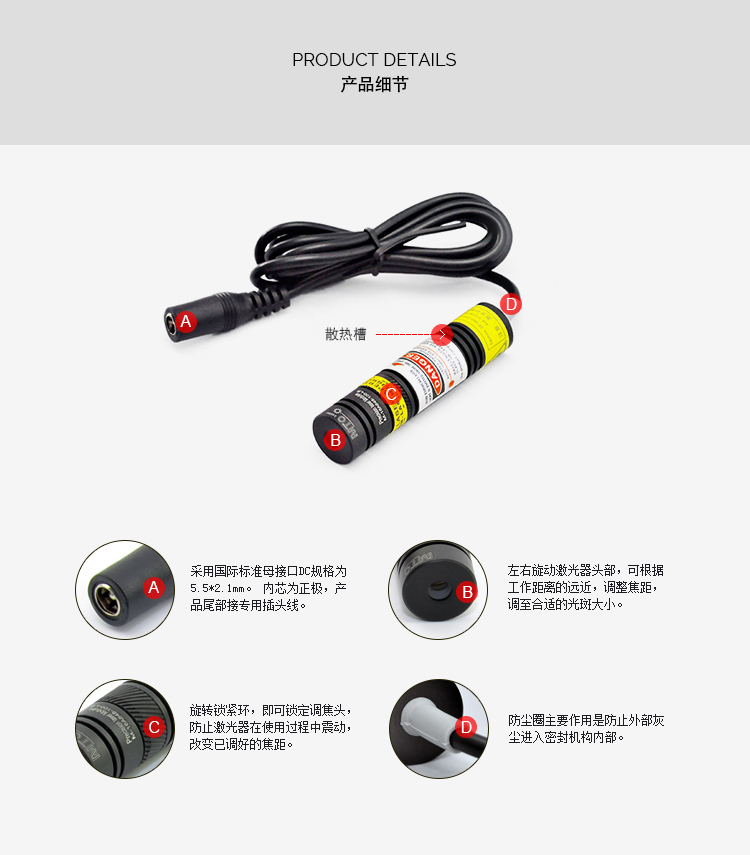 型号:YD-L660P200-A16-68光斑形状:一字线线宽与线长:可调输出波长:红光 650nm工作电压:DC-2.8-3.2V输出功率:≤200mW工作电流:≤250mA尺寸:Φ16*68mm工作温度 :-10~50℃储存温度 :-40~85℃激光等级:Class ⅢB(5-500mW)结构特点:原装进口二极管+金属外壳+透镜+恒定功率电路板+插头线