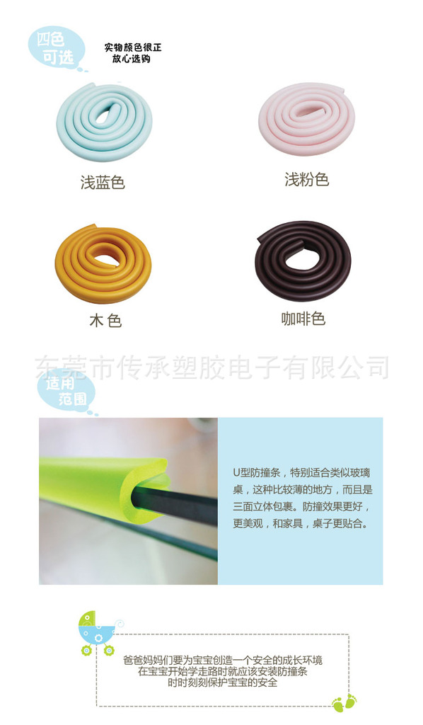 本产品可用于木板、玻璃、铝制合金、陶瓷砖、大理石、金属、水泥、等有表面之用具、家具、墙角等家居用品上,产品自配双面胶可牢固粘于桌面,防护宝宝不慎撞伤而受到严重的伤害。