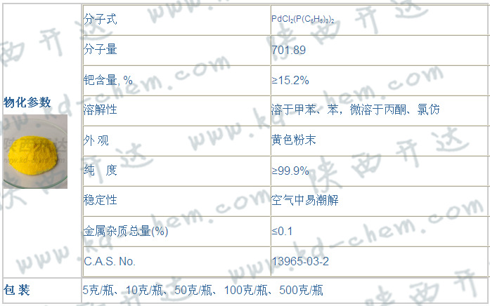英文名称:Trans-Dichlorobis(triphenylphosphine) Palladium(II)