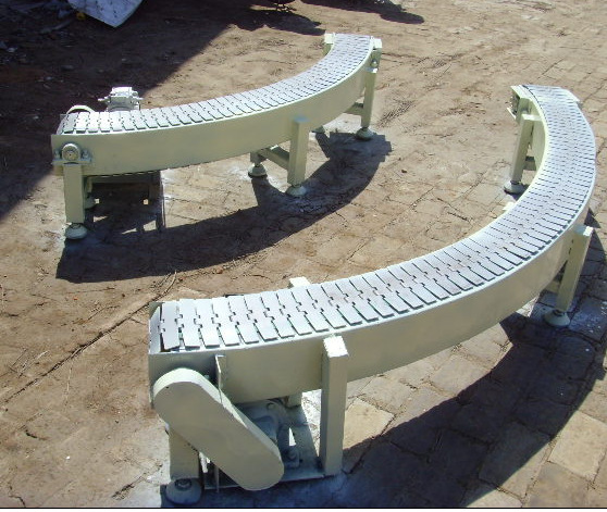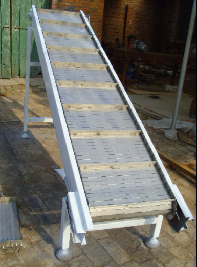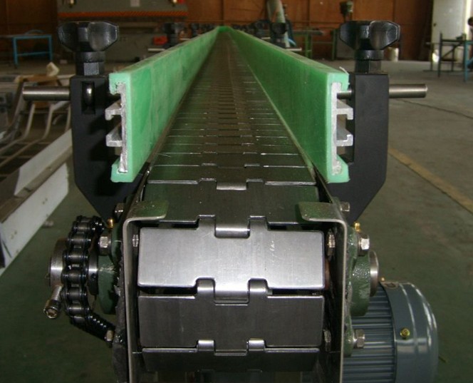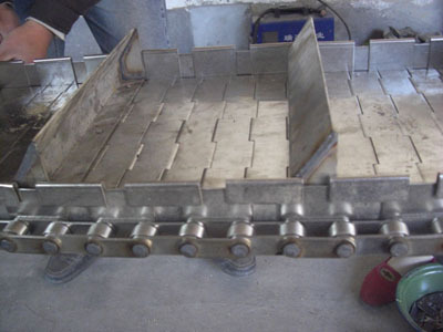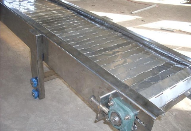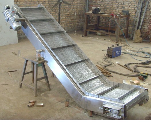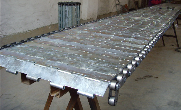链板输送机:是以循环运行的链条作为牵引构件,以链板作为承载构件的输送设备。板式输送机在冶金,煤炭,化工,电力,机械制造及国民经济的其他工业部门中均得到广泛的应用。它可沿水平或倾斜方向输送各种散状物料或成件物品,也可以用于流水生产线总运送成件物。由于他的承载部分均有金属材料构成,因而与其他连续运输机械相比,它可以输送比较沉重的,粒度大的,磨琢性强的物料或成件物,并且可以输送600-700度的高温物料或成件物。
