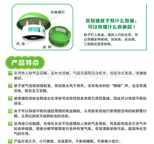 本品特别之处是改良了发光原件,由市场上传统的荧光灯改为更能吸引蚊子的LED特殊波段色温,对人体无任何害处,采用更为先进的恒流电源供电,使产品更安全,使用寿命更长,比市场上传统荧光灯使用寿命高3倍以上(传统荧光灯式使用寿命在6个月);