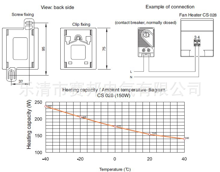 订货代码Art.No导轨安装Clip fixing | 订货代码Art. No螺丝安装Screw fixing | 操作电压Operating voltage | 功率Heating capacity | 尺寸Dimensions | 重量Weight | 02800.0-00 | 02800.0-01 | 230VAC,50﹨60Hz | 150W | 90×85×111mm | 0.5 Kg | 02811.0-00 | 02811.0-01 | 230 VAC 50﹨60Hz | 250W | 90×85×111mm | 0.5 Kg | 02810.0-00 | 02810.0-01 | 230 VAC50﹨60Hz | 400W | 90×85×111mm | 0.5 Kg | 02800.9-00 | 02800.9-01 | 120 VA50﹨60Hz C | 150W | 90×85×111mm | 0.5 Kg | 02811.9-00 | 02811.9-01 | 120 VAC50﹨60Hz | 250W | 90×85×111mm | 0.5 Kg | 02810.9-00 | 02810.9-01 | 120 VAC50﹨60Hz | 400W | 90×85×111mm | 0.5Kg |