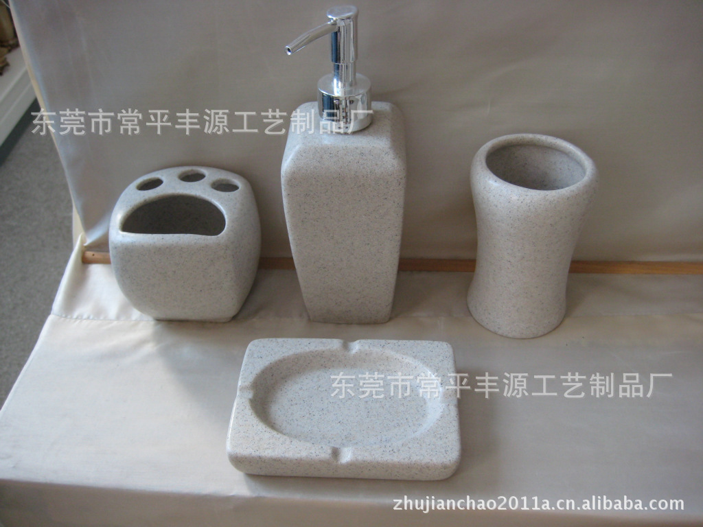 【产品组成】树脂卫浴套件由乳液瓶1个,牙刷架1个、皂盘1个,漱口杯1个组成四件套;也可由乳液瓶1个,漱口杯1个,杂物桶1个,纸巾架1个 ,牙刷架1个、皂盘1个组成套六件套。另外如 果需要可以分别加一个口杯组成七件套和五件套。