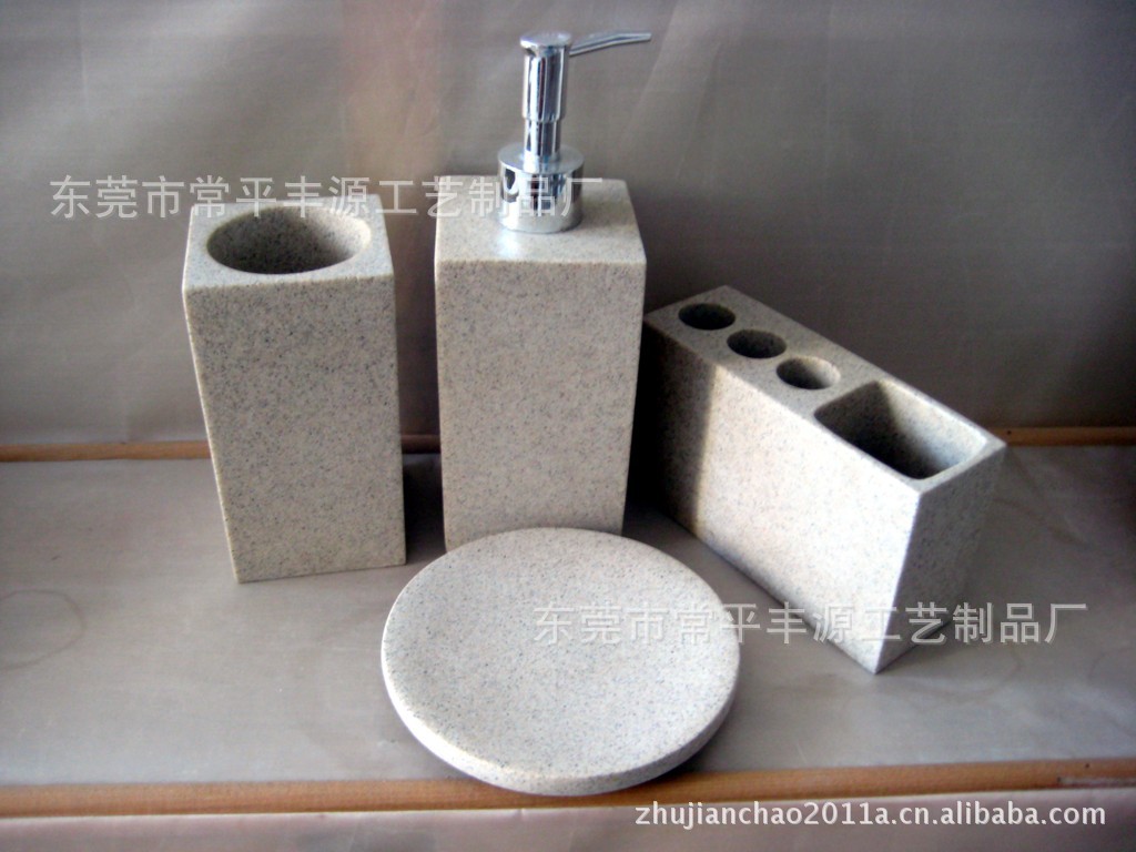 【产品组成】树脂卫浴套件由乳液瓶1个,牙刷架1个、皂盘1个,漱口杯1个组成四件套;也可由乳液瓶1个,杂物桶1个,纸巾架1个 ,漱口杯1个,牙刷架1个、皂盘1个组成套六件套。另外如 果需要可以分别加一个口杯组成七件套和五件套。