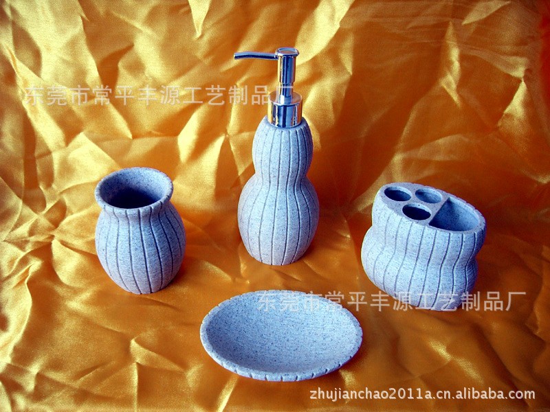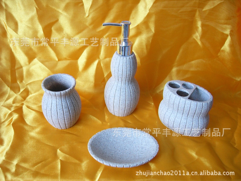 【产品组成】树脂卫浴套件由乳液瓶1个,牙刷架1个、皂盘1个,漱口杯1个,组成四件套;也可由乳液瓶1个,漱口杯1个杂物桶1个,纸巾架1个 ,牙刷架1个、皂盘1个组成套六件套。另外如 果需要可以分别加一个口杯组成七件套和五件套。