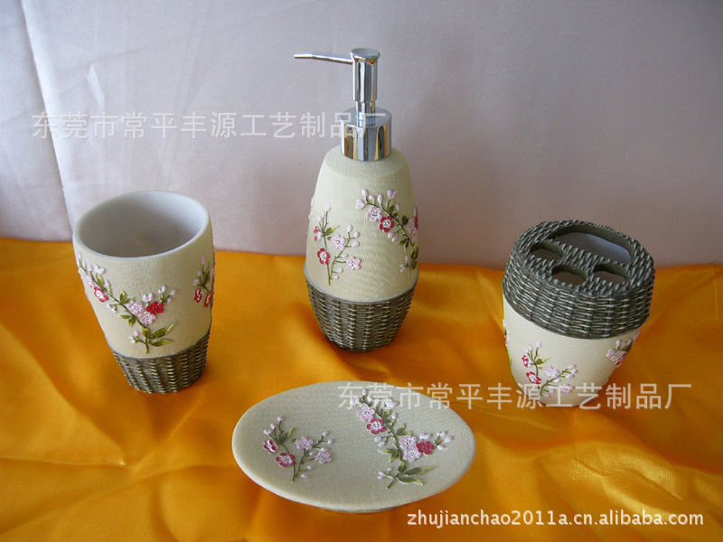 【产品组成】树脂卫浴套件由乳液瓶1个,牙刷架1个、皂盘1个,漱口杯1个 组成四件套;也可由乳液瓶1个,漱口杯1个,杂物桶1个,纸巾架1个,牙刷架1个、皂盘1个组成套六件套。另外如 果需要可以分别加一个口杯组成七件套和五件套。