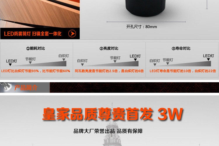 华强王正品 3寸 3W LED防雾筒灯 扫镍全套一体化天花灯浴室厨房