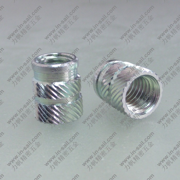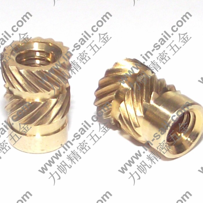 铜嵌件的主要的用途是将产品注塑在一些塑料件内,安装后可以在塑料件形成一个有效的内螺纹。其作业方式是将产品加热后嵌入到塑料件里面或是直接采用模具注塑。因为黄铜具有较好的导热性,加热后将铜嵌件压入塑料基体可以使产品迅速变热加快工作效率,加热后的铜嵌件也可以快速地将热量传导给塑料件,从而使塑料孔周边变软,从而快速将产品压入孔内。如果采用模具注塑,铜嵌件被热注塑进塑料件后由于外径有压花工艺,成形后和铜嵌件形成一定的磨擦力和咬和力,可以使之固定在里面使之不能脱落。
