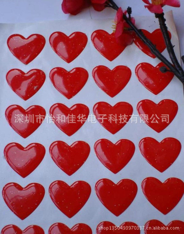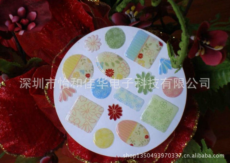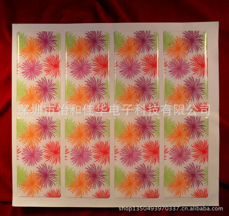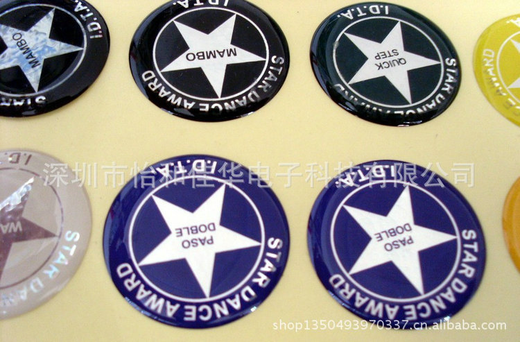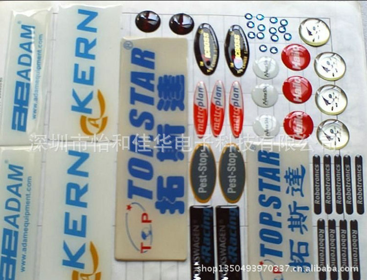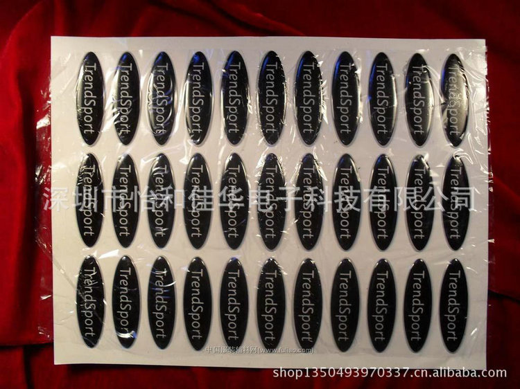基材:不干胶,PVC,光银龙、拉丝银等各种印刷材料。滴胶:软、硬环氧树脂(AB胶)、PU胶。背胶:3M、T4000、G9000、等各种双面胶纸。特点:表面光亮透明,色彩亮丽、易粘贴。用途:可用于高档包装,适用于包括电子电器,通讯数码,运动器材,消费电子,视讯音响,玩具礼品,工艺饰品,日用品,汽车摩托车,制鞋制衣,五金塑胶等各行各业。