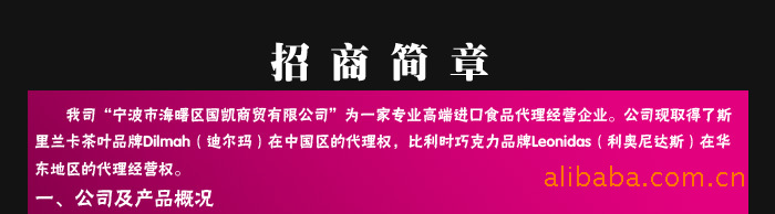 我司“宁波市海曙区国凯商贸有限公司”为一家专业高端进口食品代理经营企业。公司现取得了比利时巧克力品牌Leonidas(利奥尼达斯)在华东地区的代理经营权,以及斯里兰卡茶叶品牌Dilmah(迪尔玛)在中国区的代理经营权。