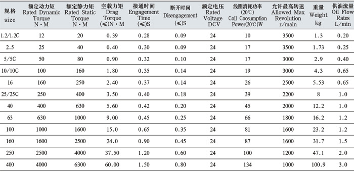 格 | 额定动力矩 N.m | 额定静力矩N.m | 空载力矩≤N.m | 接通时间 ≤S | 断开时间 ≤S | 额定电压 DC V | 线圈消耗功率(20°C) | 允许最高运转r/min | 重量 kg | 供油流量 L/min |