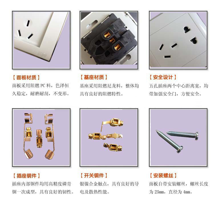 (7)插座保护门:采用全方位防触电的保护门,有效防止单极插入,避免儿童捅插触电。